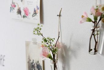 Unos simples frascos de cristal con tapón pueden servir para realizar estos jarroncitos de pared.Una vez quitados los tapones de los frascos, utilizamos la rosca para atar a su alrededor una cuerda, eso nos dará seguridad.Después coge flores frescas, como fresias, ranúnculos ó ramas de membrillo e introdúcelas en su interior y a continuación los cuelgas de la pared.