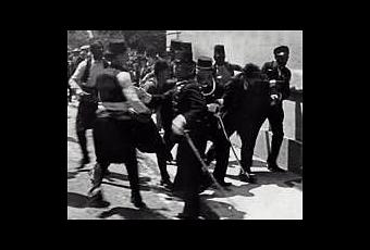 Las principales causas de la I Guerra Mundial fueron el intenso nacionalismo de la época, la rivalidad económica de las potencias europeas y, sobre todo, la carrera por conseguir la mayor cantidad de armas. El conflicto estalló de forma definitiva el 28 de junio de 1914; ese día, Francisco Fernando de Habsburgo, archiduque de Austria y heredero del Imperio Austro-Húngaro, y su esposa, fueron asesinados en la ciudad bosnia de Sarajevo. La fotografía muestra la detención del asesino, un nacionalista serbio que se llamaba Gavrilo Princip.