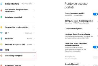 - En la opción conexión y compartir, podrás visualizar todos los ajustes necesarios para activar esta función. Puedes compartir datos móviles a otro dispositivo de dos formas: Vía cable USB o mediante un punto de acceso Wi-Fi creado por el propio dispositivo. Si prefieres usar un cable USB, sólo debes conectarlo a tu smartphone y también a tu PC.