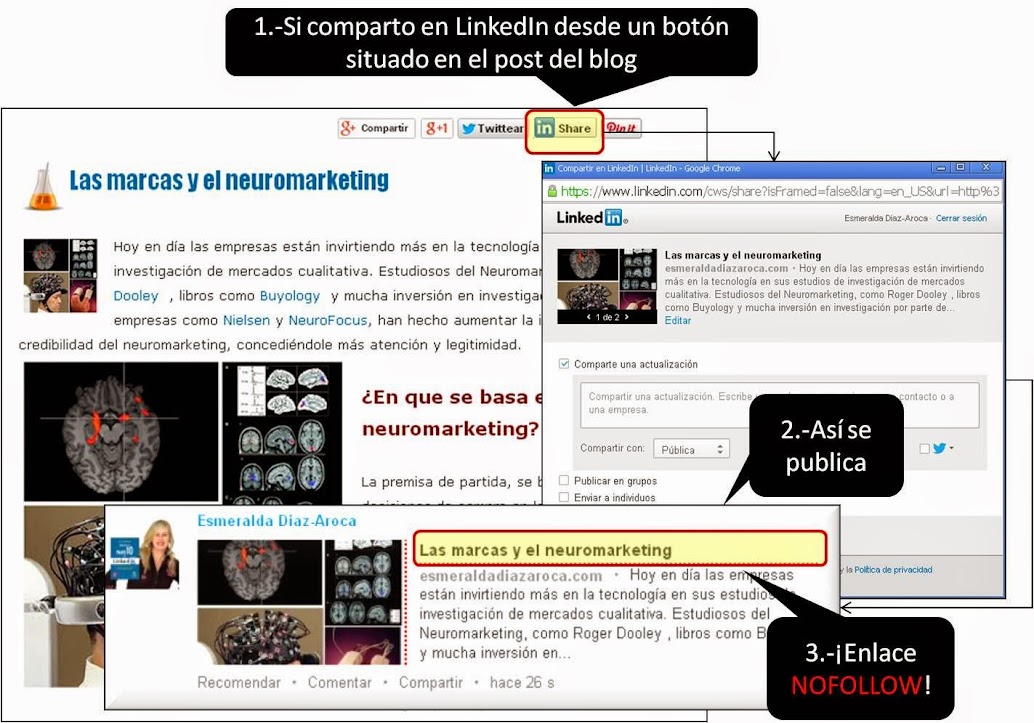 Imagina que te gusta un artículo concreto y lo quieres compartir directamente en LinkedIn. Pues vas al botón de "compartir en LinkedIn" situado en la cabecera del post (como en el ejemplo) y listo. pero si te fijas, este enlace resultante será NOFOLLOW
