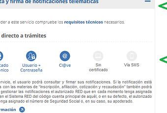 Una vez dentro, desplegamos el segundo menú donde pone "Consultas y firma de notificaciones telemáticas" y accedemos mediante el servicio del que dispongamos: Cl@ve, certificado electrónico o usuario y contraseña.