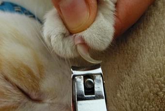 Le cogemos la mano, apretamos suavemente sobre la base de la uña hasta que se despliegue entera, como se muestra en la foto. Después, con un cortauñas que corte bien (es lo que yo uso y me va bien, pero también venden tijeras especiales), ponemos la uña tumbada y se la cortamos de lado, no de frente. Hay que tener cuidado con cortarle únicamente la punta de la uña, la zona transparente. Si cortamos más abajo donde empiezan las venitas o en la parte rosada, le haremos daño y sangrará. Si no estás segur@, es mejor cortar de menos que de más.