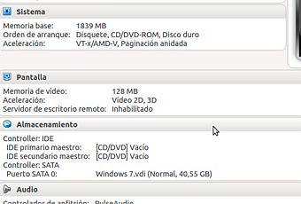 Ahora seleccionamos en la izquierda pantalla la opcion “Pantalla”, lo anterior lo dejaremos como esta, y donde pone “Memoria de vídeo” lo ponemos al máximo y pinchamos donde pone “Habilitar aceleración 3D”.Después, en la parte de la izquierda seleccionamos ”Almacenamiento” y nos aparecerá esto: Ahora hay que pinchar en el icono que señala la flecha y nos aparecerá un recuadro con tres opciones y seleccionamos la de la derecha “Seleccionar disco”. Entonces tendremos que seleccionar la iso de Windows que tenemos para que cuando iniciemos la maquina virtual lo usemos para instalar Windows XP. Una vez hecho esto pinchamos en “Aceptar” abajo a la derecha y ya tendremos casi terminada la maquina virtual.Ahora podemos dar en “Iniciar” y entonces arrancara la maquina virtual que hemos creado, nos aparecerá una ventana que sera como si fuese el monitor de la maquina virtual, en el cual, si hemos seguido todos los pasos correctamente se iniciara la instalación de Windows como si de otro ordenador se tratase.Puede ser que os salga una mensaje diciendo algo sobre que vuestro usuario no esta añadido al grupo de usuarios de USB de virtualbox, esto lo detallo en otro articulo aqui, y también que cuando Ubuntu se actualiza y se instala una nueva versión del Kernel el programa ya no funciona, también detallo como arreglarlo, es muy sencillo.Una vez terminada la instalación de Windows en la maquina virtual, seria muy recomendable, instalar una cosa que se llama “Guest aditions” que esta dentro del propio programa Virtual Box y que añade funcionalidades a la maquina virtual como la posibilidad de utilizar carpetas compartida para pasar archivos desde Ubuntu a la maquina virtual de forma instantánea y otras cosas útiles Cuando la maquina este corriendo, en el menú ”Dispositivos” al final hay una opción que pone “Instalar Guest Additions”, pincháis en ella y lo instaláis Ademas la maquina virtual se vera mejor, es como si actualizase los drivers para windows en la maquina virtual y así la podréis usar a pantalla completa como si solo estuviese Windows.Seguro que se me quedan algunas cosas en el tintero, pero si habéis leído el articulo y tenéis cualquier mínima duda, ponedla con un comentario y os la resolveré lo mas rápido que pueda.Espero que este articulo os haya sido de utilidad, y si ha sido así compártelo, muchas gracias.