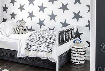 El papel pintado es otro clásico que siempre funciona y en concreto, el papel pintado de estrellas en muy popular en la decoración de los dormitorios para niños, niñas y adolescentes.El color y tamaño de las estrellas tienen mucho que ver con su acabado... No es lo mismo un papel con pequeñas estrellas rosas, que un papel con grandes estrellas negras... ¿No os parece que este último puede quedar bien para una habitación de temática más rockera?