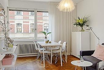 Si el piso es pequeño y comparte estancias (salón-comedor-cocina) intentaremos seguir una linea de colores para que todo esté integrado, en este caso han optado por la gama de los grises complementándola con rosa pastel, trasmitiendo una sensación de calma, serenidad y elegancia.