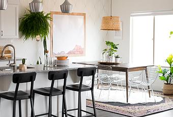 La semana pasada on enseñamos el antes y después de un salón que nos dejó a todos alucinados por la originalidad y el buen gusto combinando piezas muy diversas (lo podéis ver aquí), y hoy seguimos viendo la transformación de este maravilloso espacio, esta vez centrándonos en la zona de comedor con cocina americana abierta, que se integra perfectamente con el estilo del resto del espacio de estar, pero con una personalidad muy diferente. El papel pintado, los azulejos tipo metro (subway tile), las sillas de rejilla metálica, las lámparas, el juego de alfombras y las muchas plantas que adornan cada rincón, son los que le dan vida a este espacio. Los nuevos taburetes llenan a la perfección la gran barra americana y el conjunto en general es mucho más acogedor. ¿Lo vemos?