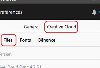 En la pestaña "Archivos", puede desactivar Creative Cloud Sync desmarcando la casilla. Esto desactivaría la sincronización en la nube y los archivos no se eliminarían localmente.