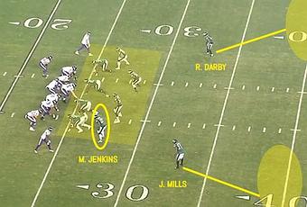 ¿Qué ventajas tiene esta formación? La primera es detener el juego terrestre debido al número de defensivos que se encuentran cerca de la línea de golpeo. La segunda es poder cargar al quarterback con los linebackers o incluso con Jenkins, quien lo ha hecho en muchas ocasiones. Incluso el mismo Jenkins puede presionar la salida del tight end o running back para no permitirle mucha comodidad para correr sus rutas.