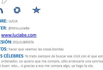 Y ELLA SOLITA SE PRESENTA Me llamo Lucía y soy una equilibrista con quince kilos de más. Embarazada de mi segundo paxarito, trato de mantener la calma viviendo perdida en el campo, con una marca que se llama como yo y con un marido al que vuelvo loco con mis historias cada día. CAMBIOS, CAMBIOS....Mi vida ha cambiado muchísimo a raíz de tener un blog. Cuando empecé la marca, necesitaba un espacio donde poder contar al mundo lo que hacía. No tenía presupuesto ni mucha idea de lo que iba a hacer, así que opté por un blog como escaparate y vía en la que contar mis historias. Desde un punto de vista profesional, gracias al blog he podido contar mi historia, he generado una marca y podría decir que Lucía Be es hoy lo que es gracias en gran parte al blog. Muchos de mis clientes vienen a mí porque se identifican conmigo, porque les gusta lo que escribo o los rollos que suelto... generar esa empatía o esa conversación me ha permitido consolidar mi marca, generar ventas y llegar a fin de mes. Poder vivir de lo que quiero, vamos. Ahora mismo en Internet hay muchísima información, así que hay que mantenerse vivo, gritar "estoy aquí!", llamar la atención para que la gente decida quedarse contigo y no con otros. El blog hace esto posible. Pero no sólo el blog, también las redes sociales. Yo noto muchísimo que cuando bajo la guardia, tengo menos pedidos, menos mails... pero cuando estoy dando la murga con milongas, historias y dibujos, la cosa se mueve. Yo trato siempre de buscar ese click con el que está al otro lado del ordenador, no quiero que me compre, sólo arrancarle una sonrisa, hacerle pasar un buen rato... si gracias a eso me compra algo, ya hago la ola. Por la parte personal, también mi vida ha cambiado mucho. Escribir me ha ayudado a conocerme mejor, a profundizar, a adquirir hábitos de constancia... he querido cerrar el blog muchas veces, sobre todo al principio, porque no encontraba el camino, así que supongo que también me ha ayudado a conocer mis límites e intentar superarlos. Y lo más importante: el blog me ha conectado con muchas personas. Es impresionante como une el vínculo de leerse. Después de algún tiempo, he podido conocer en persona a gente a la que seguía a través de sus blogs y era algo casi mágico, como si nos conociéramos de siempre... Al final, la gente de tu alrededor siempre piensa que andas algo mal de la cabeza. Tú tienes una especie de vida paralela con tus amigos virtuales, y luego aterrizas a tu otra vida, con otros temas de conversación y otras historias. Por eso, cuando cruzas vida real y vida 2.0 es un subidón tremendo. La gente me escribe y me cuenta historias preciosas, o simplemente me dice "hola, quería saludarte porque he visto hoy en instagram que se te había escacharrado el móvil y quería mandarte ánimos". ¡Es impresionante! Hace nada fui a la boda de una chica que me compró un tocado hace dos años. Seguimos escribiéndonos, leyéndonos... y nos hemos hecho muy amigas. Es de esas cosas mágicas que tiene internet.NEGATIVO.....Todo tiene su cara B, y el tema de las redes sociales por supuesto que lo tiene. Por una parte, el enganche que supone. Estamos demasiado conectados, demasiado expuestos, y a veces no disfrutamos de una cena porque estamos obcecados en hacer la foto mona para colgarla en instagram. Parece que si no lo cuentas, no existe. También me preocupa el tema de que a veces se trata de una realidad filtreada, todo el mundo enseña la parte bonita en las redes sociales, ya no quedan fotos de perfil feas en facebook, parece que vivimos una vida Pinterest y eso puede generar cierta ansiedad o frustración. También las redes sociales nos han traído mucho aborregamiento, ahora que todo se comparte es mucho más fácil copiar y cuesta mucho encontrar cosas verdaderamente auténticas. En fin, el tema da para mucho, creo que hay que desmitificar las cosas, reírnos más de nosotros e intentar cruzar los dos mundos: el virtual y el físico, para poner las cosas en sus sitio. Y la desconexión cada cierto tiempo viene muy bien.¿QUÉ PASARÍA SI TE DIJESE QUE NO PUEDES USAR MÁS LAS REDES?Imposible, mi trabajo depende de ellas. No me imagino sin ellas, me daría un telele, me tendrían que llevar a un rehab. ¿Soy una adicta?....