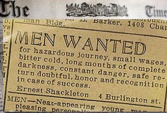 El anuncio de Shackleton para buscar miembros para su tripulación era diferente al habitual anuncio de empleo que todos vemos en los periódicos o en la web. No dijo QUÉ buscaba. Su anuncio no decía
