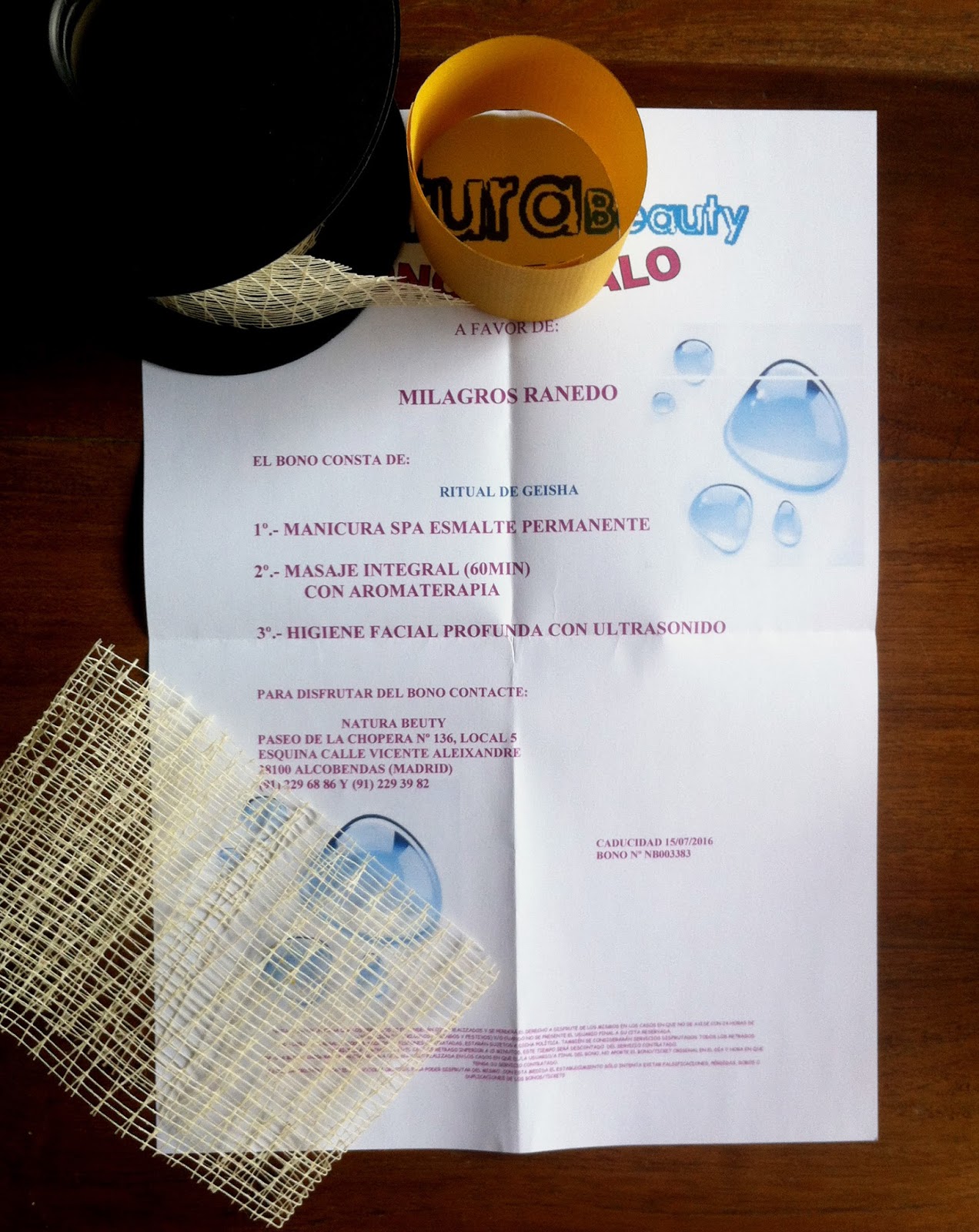 A continuación doblaremos nuestro papel en cuatro partes. Por la mitad, y otra vez por la mitad. Mediremos la tira ancha hasta cubrir la parte más larga de nuestro bono regalo. Después cortaremos la otra cinta con un corte diagonal, para que quede estético. Pegaremos ambas cintas haciendo un pequeño rulo con un trocito de celo que pegaremos en la cara interna del lazo.