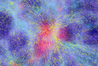 Snapshot from a computer simulation of the formation of large-scale structures in the Universe, showing a patch of 100 million light-years and the resulting coherent motions of galaxies flowing towards the highest mass concentration in the centre. The snapshot refers to an epoch about 10 billion years back in time. The colour scale represents the mass density, with the highest density regions painted in red and the lowest in black. The tiny yellow lines describe the intensity and direction of the galaxy’s velocities. Like compass needles, they map the infall pattern and measure the rate of growth of the central structure. This depends on the subtle balance between dark matter, dark energy and the expansion of the Universe. Astronomers can measure this effect using large survey of galaxies at different epochs in time, as shown by the new research.