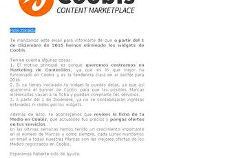 Nos avisan en el correo que si tenemos puestos sus widget no hace falta que los quitemos, ya que el aviso para los exponsor que quieran encargarte trabajos seguirá vista, y así los patrocionadores pueden conocer tu blog y saber si quieren encargarte trabajos, pero como no tendrá publicidad, no reportará beneficios.Cuando los posibles exponsor entren en este banner si le dejáis colocados lo que verán será vuestra Ficha en CoobisSi no lo quitas, quedará como un simple banner de Coobis, que lleva a la ficha de tu blog a su plataforma, como lo tienen en otras plataformas que monetizan blogs, pero con la diferencia que en lugar de llevar directamente a su plataforma, lleva a tu ficha de tu blog en su plataforma.En resumen los mencionados anteriormente, son los cambios que nos esperan para el próximo año en la plataforma CoobisEspero que os sirva de utilidad, por si todavía no conocíais la plataforma y estáis interesados en monetizar vuestros blogs, pero ahora solo con marketing de contenidos, es decir, mediante banners en el blog, fijos, con pagos mensuales por tenerles puestos durante un tiempo determinado (no pago por clics ni por ventas) y mediante la creación de post o publicación de post ya creados.