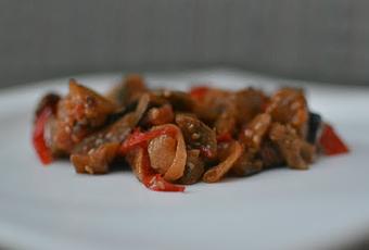 Remueve bien y, a continuación,echa los pimientos y sofríe hasta que todas las verduras estén tiernas. Agrega el puñado de pasas, una pizca de sal. Sigue cocinando e incorpora el vinagre de vino tinto y la miel. Sigue removiendo procurando que no se pegue, luego baja el fuego al mínimo y con un pasapurés o una batidora de mano aplasta ligeramente el sofrito, remueve.Mezcla con la berenjena previamente cocinada y deja a fuego lento un rato más. Apaga y deja que reposa para que se unan todos los sabores. Se puede servir caliente o frío.