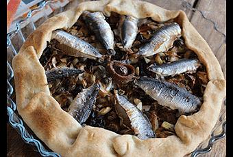 8-Disponer el relleno cuidadosamente y repartirlo por toda la bandeja. Colocar las sardinas por encima, decorar con la anchoa en el medio. Por último dobla las puntas hacia dentro.