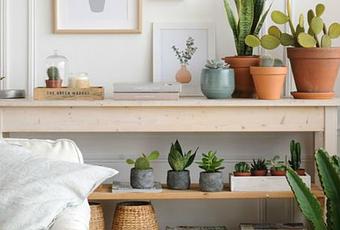 En muchas ocasiones hemos visto estanterías con plantas. Un buen truco para crear movimiento es colocar un par de plantas en cada esquina para crear equilibrio estético y que no quede un conjunto monótono ¡Fíjate en la imagen inferior para seguir el patrón decorativo!