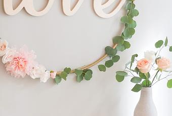 Las coronas gigantes de flores para bodas se han puesto de moda recientemente y están creando tendencia. Son sencillas de hacer, y además son económicas. Además, disfrutarás del proceso de crear tu propia corona gigante de flores personalizada. Las coronas gigantes suelen estar cubiertas con flores y ramas. Son muy versátiles y puedes utilizarlas para decorar fondo del Candy Bar, el Photobooth, la sala del banquete, el seating plan, o incluso utilizar una corona gigante de flores a modo de arco para la ceremonia. Las coronas de flores gigantes también son ideales para utilizarlas en la sesión de fotos de la boda o incluso como columpio.