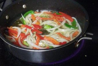 Pon el aceite a calentar y le echas la cebolla y los ajíes que has picado a que se cosan un poco primero.