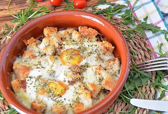 Repartimos en las ollitas de barro las verduras y el pan, encima ponemos la mozzarella desmigada, y los huevos, espolvoreamos con sal y orégano.