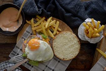 (Para 2 personas)Para la carne:250 gr. de carne de ternera picada*1 cucharada de ajo molido1 cucharada de cebolla molida1 cucharadita de hierbas provenzales1/2 cucharadita de mezcla de 5 pimientas molidas1 cucharadita de sal1 huevo M2-3 cucharadas de pan rallado**Aceite para hacerla a la planchaPara la salsa:2 cucharadas colmadas de mahonesa1 cucharada colmada de ketchup1 cucharadita de tabasco chipotle***1 cucharadita de salsa Worcestershire1 cucharadita de salsa burger (opcional)****1 cucharadita de brandy (opcional)*****Para el pan: 14 gr. de levadura seca de panadería270 gr. de agua templada75 gr. de aceite vegetal (suave si es de oliva)35 gr. de azúcar1 huevo L1 cucharadita de sal450 gr. de harina panaderaToppings de la hambuguesa:Cebolla******2 pepinillos de los extra grandes, cortado en rodajas longitudinales2 lonchas de queso cheddar (el amarillo)Unas hojas de lechuga iceberg (o la que prefieras), en juliana2-4 lonchas de bacon, fritas2 huevos fritosLa salsa que hemos preparado antes