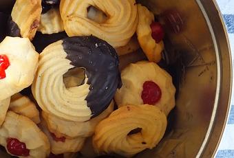6. Rellena una manga pastelera con la masa (cuanto menos la llenes más fácil de manejar será) y escudilla (dispensa) la masa sobre una placa de horno engrasada o cubierta de papel de horno o sílicona. Haz las pastas de la forma y tamaño que prefieras: aros, leguas rizadas, rosas, herraduras... Si quieres hacer pastas con guindas o similarres, decoralas antes de meterlas al horno. Procura que las galletas sean de tamaño similar, para que todas necesiten el mismo tiempo de horneado. (Si no tienes o no quieres utilizar una manga pastera puedes meter la masa en la nevera hasta que esté fría y sea más moldeable. Cuando esté lista solo tendrás que estirarla con un rodillo y dar la forma que más te guste a las galletas, al hornearlas no la perderán. Si ves que la masa se pega un poco espolvorea la superficie de trabajo con azúcar glas y si la masa se pega demasiado es probable que no esté suficientemente fría).