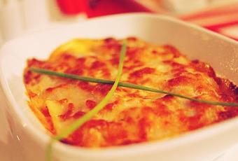 1. Para armar la lasaña en moldes individuales con una bandeja refractaria verter un poco de salsa blanca, aceite de oliva en el fondo cubrir con hojas de lasaña.