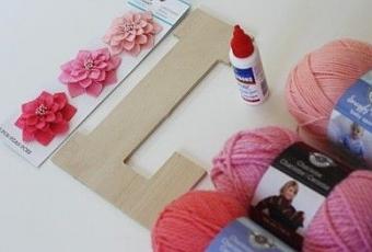 Los materiales que necesitamos son muy sencillos, letras de madera, lana, pegamento y algún adorno como el de la fotografía, para darle el toque final.
