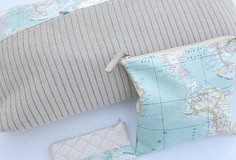 Los trozos de tejido Mapamundi son los que determinan el diseño de las bolsas, neceseres...
