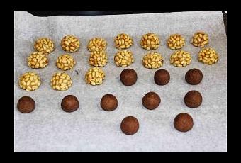 Se cubren de clara de huevo por fuera, que sirve de adhesivo para una capa de piñones que se coloca encima.