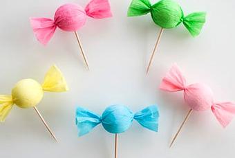 Recortamos rectángulos de papel crepe.Pasamos pegamento en la pelotita, la colocamos en el centro del rectángulo.Hacemos como un rollito usando, si necesario, unas gotitas de pegamento.Luego le damos forma de caramelo, atamos con hilo blanco y recortamos los sobrantes. Colocamos el palito en la parte inferior.