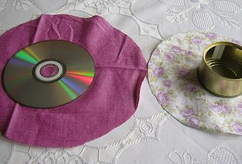 Buscamos tela de nuestro agrado y cortamos dos círculos, uno de 22cms y otro de 17cms. Pasamos hilo alrededor y tiramos para fruncirlo alrededor del cd.