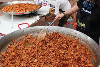 Pero mi principal trabajo fue la comida, 5 paelleras, 47 kg. de arroz, 15 kg de cebollas, 40 kg. de carne... y muchos nervios pensando en que todo saliera bien, porque las cuatrocientas y muchas sillas del comedor se iban a llenar de gente que quería comer, y era una gran responsabilidad. Y aunque ya se lo he agradecido personalmente lo quería hacer aqui otra vez, gracias a mis cinco ayudantes, imposible hacerlo yo sola.
