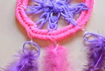En este tutorial vamos a aprender cómo hacer un atrapasueños de gomas para el coche. Es un objeto que se ha hecho muy popular para colgarlo del retrovisor siempre y cuando no afecte a la visibilidad y seguridad de la conducción. Es un vídeo del canal Alexa C. Los materiales que se han empleado para realizar el trenzado de esta pulsera son 77 gomitas de los siguientes colores: 52 gomas granates (o rosas como en la foto) para el borde y 25 gomas moradas para el interior. Además necesitaras tres anillas para los cierres y tres plumas.No es necesario usar ningún telar pero si dos bolígrafos para poder tejer.