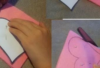 Como en otras ocasiones, ha sido mi sobrina la que ha hecho el "paso a paso" de hoy, eso sí, después de terminar los deberes ;) Empezamos marcando sobre fieltro -podéis poner dos trozos juntos para sacar las dos partes del colgante- la figura que queráis preparar -ella eligió un corazón rosa, cómo no!-.