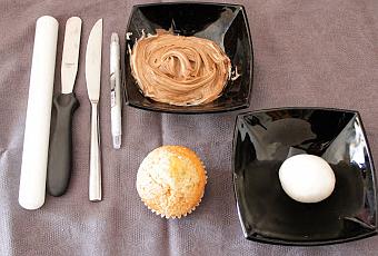 Muy sencillo, simplemente necesitamos una magdalena, un poco de nutella, fondant blanco y un rotulador comestible.