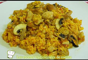 la elaboración de este arroz es muy simple, ya que tan solo hay que sofríe bien la carne, echar los ajos picados, el pimentón rojo y el tomate, luego se añade el arroz y los champiñones, se da un par de vueltas y se vierte el caldo, este puede ser de carne o de ave, el que prefieras, yo te aconsejo que sea de carne suave, incluso si no dispones de caldo puedes usar concentrado de carne diluido en agua.