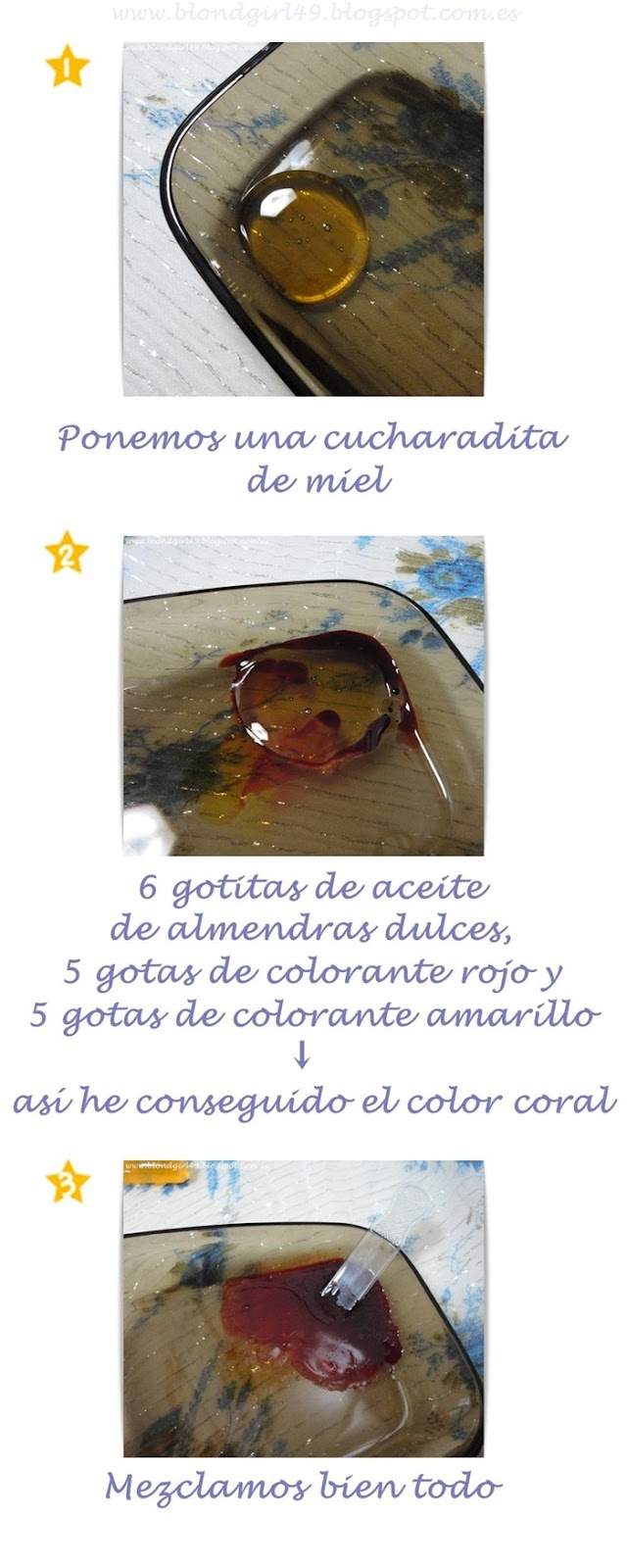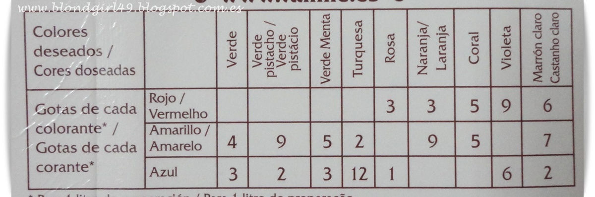 EXFOLIANTE LABIAL CASERO:He usado productos que se suelen usar en pastelería porque así me aseguro que no son tóxicos, id con mucho cuidado con el tipo de colorantes o aromas que ponéis en el exfoliante labial!!!Los colorantes alimentarios son de la marca Vahiné, los podemos encontrar en muchos hipermercados, yo los compré en El Corte Inglés ya que tenían una oferta de la 2ª unidad al 70%, costaba 2,50€ así que la segunda unidad me salía a 0,75€ y en conjunto 3,25€ ¿genial no? (también los usaré en recetas jejeje)En el paquete vienen 3 tubos de 6ml con 3 colores diferentes, a partir de estos se pueden formar el resto de colores. Atrás podemos encontrar una tablita con las proporciones que debemos usar de cada color para conseguir el deseado.De aroma me decanté por el de vainilla, aunque ya tengo otros fichados en menor cantidad. Este en concreto también es de Vahiné y lo compré en el Corte Ingles a 4€ (el bote es de 200ml)Ingredientes:- Azúcar glasé- Azúcar normal- Aceite de almendras dulces- Miel- Aroma- ColoranteOs dejo la tablita de las mezclas de colorantes: