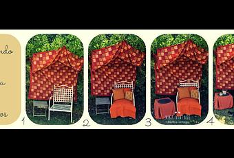 Para tener un rincón especial y veraniego, necesitaremos una tela que nos de ese aire ibicenco que deseamos, yo he utilizado una colcha de cama pequeña con un toque étnico, para colocarla solo precisaremos de un par de barras de cortina o si os es mas fácil, de un par de ramas de arboles, yo he utilizado una zona del jardín con jazmines chinos y he usado sus ramas para colocar la tela, para ello unas pinzas de madera grandes serán nuestras aliadas (así es como yo lo he sujetado), podéis usar varios sujeta manteles o la misma tela atada, ya os he dicho que serán todas soluciones low cost y de estar por casa. Cuando ya tengamos la colcha colocada, le daremos ese aspecto exótico, con una tela mas fina y volátil, de esta manera sentiremos esa sensación de frescor, cuando se levante una pequeña brisa.