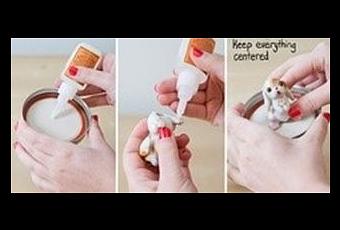 Lo primero que haremos será pegar bien la figura en la base de la tapa del tarro de cristal. A continuación, con la ayuda de un pincel, le damos una capa de barniz para protegerla del agua.