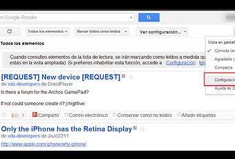2-Allí hacer clic en la ruedita y clic en Configuración de Google Reader