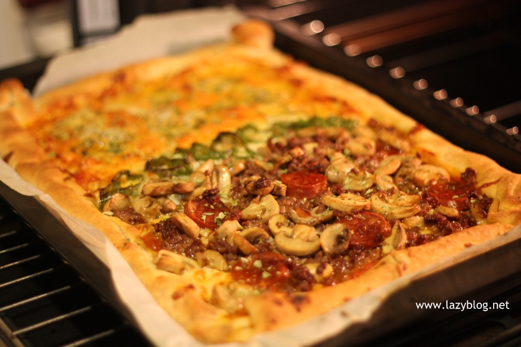 En la mitad de 4 quesos, puse también si os fijáis unos tacos de queso roquefort, espaciados para que no saturaran todo de sabor. Y ya está lista para meter al horno. Podéis montar la pizza justo antes del partido. En el minuto 25, precalentamos el horno, la metemos dentro en el minuto 30, y estará lista para apagar en el 45.