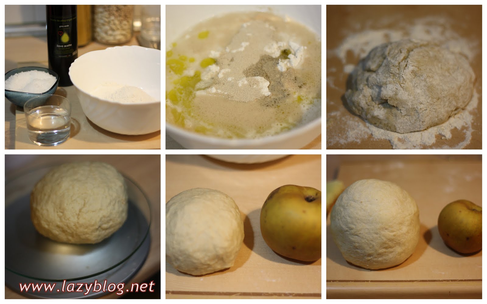 Cómo hacer una Pizza casera para el partidoPara hacer la base de la pizza, mezclamos todos los ingredientes en un bol, y removemos hasta tener una especie de masa, (tercera foto) que trabajamos durante unos diez minutos, quedando ya lisa y elástica y manejable (cuarta foto) Damos forma de bola a la masa resultante, y la cubrimos con un paño hasta que doble su tamaño. (Podéis verlo en las fotos 5 y 6, en las que la comparamos con una manzana para que os hagáis a la idea) Aproximadamente dobla el tamaño en unos 30 minutos.