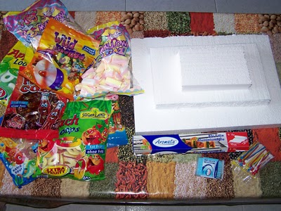 Con motivo del día de la madre (y porque yo tenia curiosidad en saberlo) he buscado como hacer una tarta de chuches. No es una cosa para comer todos los días porque no es muy sana para los dientes pero de vez en cuando en alguna celebración especial...Me parece muy fácil de realizar pero requiere de una dosis de paciencia y trabajo (todo depende del tamaño de la tarta) y los niños también pueden hacerla con nosotros aunque no se yo si en vez de poner chuches se las irían comiendo todas (bueno los mayores también lo hacemos).
