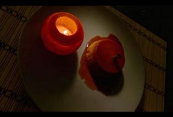 Para impresionar a tus invitados acuérdate de apagar la luz una vez que enciendas la vela, verás que efecto más bonito hace la mandarina iluminada.