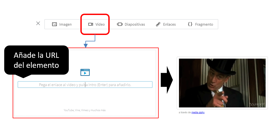Vamos a por un gif animado ahora, Mira aquí, voy a incrustar este famoso GIF de Robert De Niro cuya URL obtenida de GIPHY es esta: https://media.giphy.com/media/Ef0TRTKRVGGQw/giphy.gifAccediendo a LinkedIn Pulse, veras el área de edición. Seleccionas "VIDEO"y añades la URL del GIF.