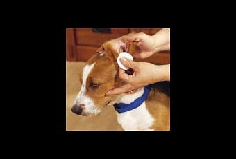 Mezcla dos partes iguales de vinagre blanco y agua en un recipiente, después empapa bien un gasa suave en la solución y úsala para limpiar el oído del perro, la gasa debe limpiar el exterior y los rincones retirando cualquier acumulación de cera y suciedad, pero no debería entrar dentro del canal, es importante que se use una gasa distinta para cada oído, una vez limpio, secar con una gasa limpia.