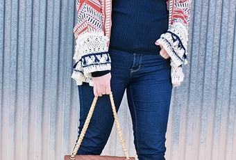 Yo opté por un total look azul, con jeans desflecados y un jersey de punto azul marino con cuello vuelto. Este jersey azul es una prenda muy abrigada por eso resulta fácil llevar el kimono encima a modo de complemento, pues le aporta un toque muy chic al look a la vez que le da color.