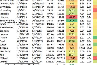 Aquí os pongo unas estadísticas de sus 595 días al frente de la Casa Blanca ,en Noviembre se celebran elecciones y los demócratas pueden perder la mayoría en la Cámara y el Senado ,es muy discutible todo lo que ha hecho pero viendo esto parece que no lo ha hecho tan mal ,desde que el entro el 20/01/2009 el Dow jones ha ganado un 26,16% ,siendo el quinto presidente que mas lo hace subir y superando ampliamente la media de todos ellos .un saludo