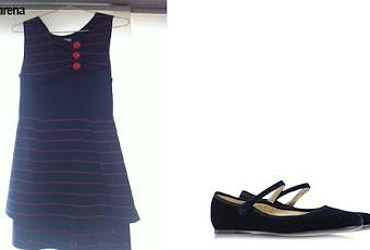 El vestido de Macarena es azul marino con detalles en rojo. Según ella, quizás algo corto. Una pieza muy bonita a la que sacarle partido. Lo combinaremos: