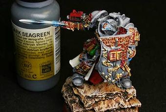 Sólo me quedaba de pegar el estandarte. Así vista la miniatura lo que menos me gustaba eran los pergaminos que les di directamente una lavado con Seraphim Sepia de Citadel Shade. Para forzar el contraste perfilé toda la miniatura con Azul Gris Claro de Vallejo Air Color.